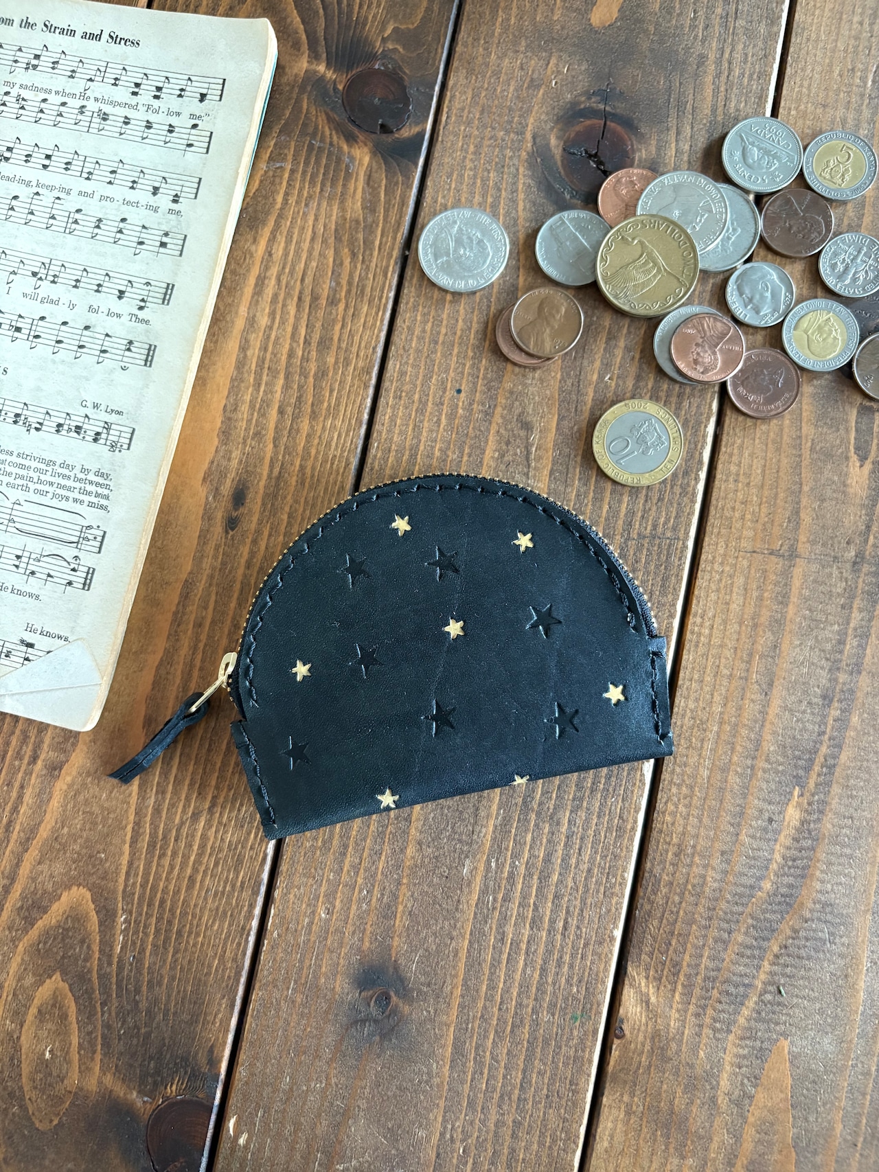 ヌメ革をブラックに染め、星の刻印を施した、シックでスタイリッシュなコインケースです。