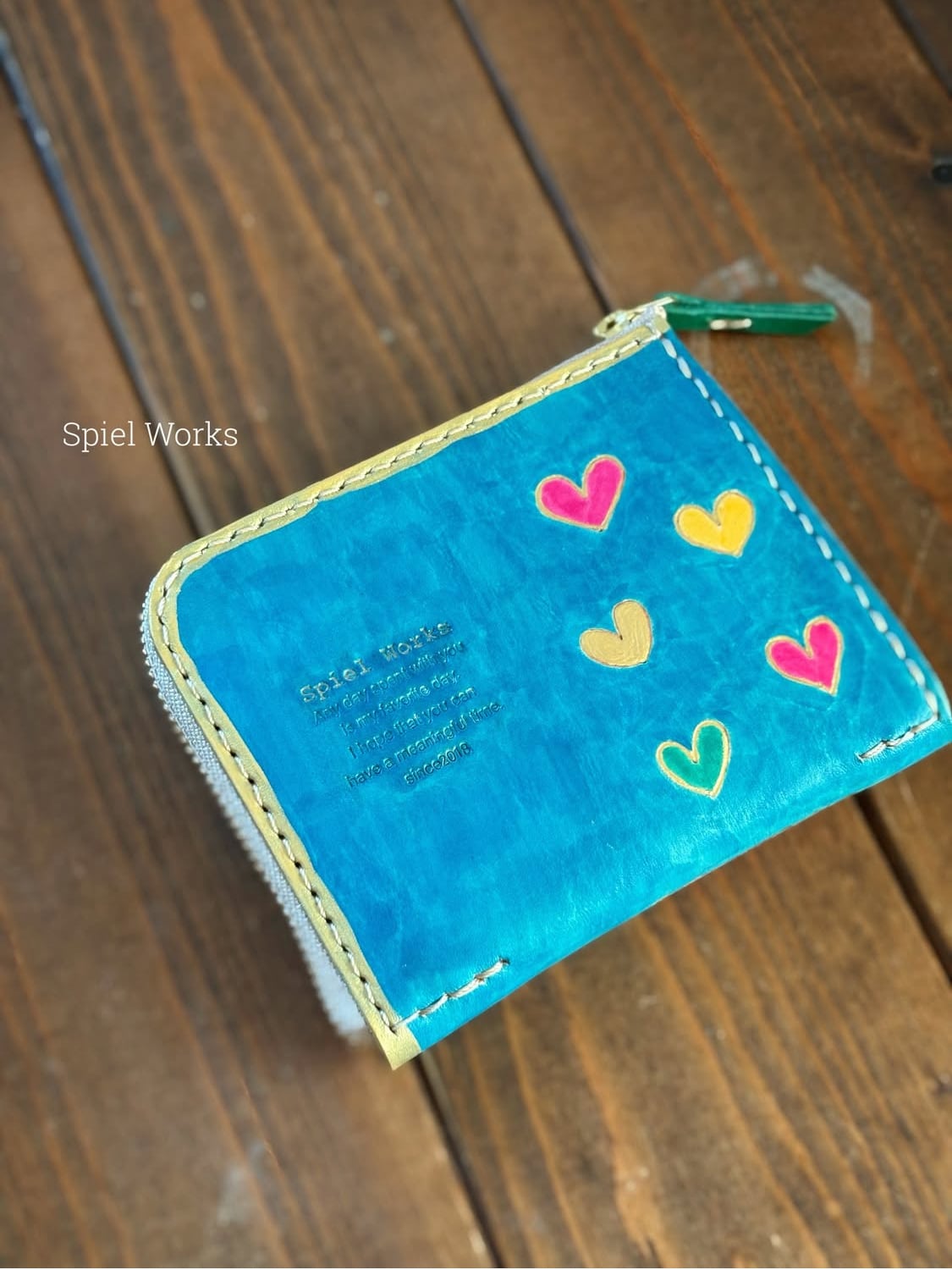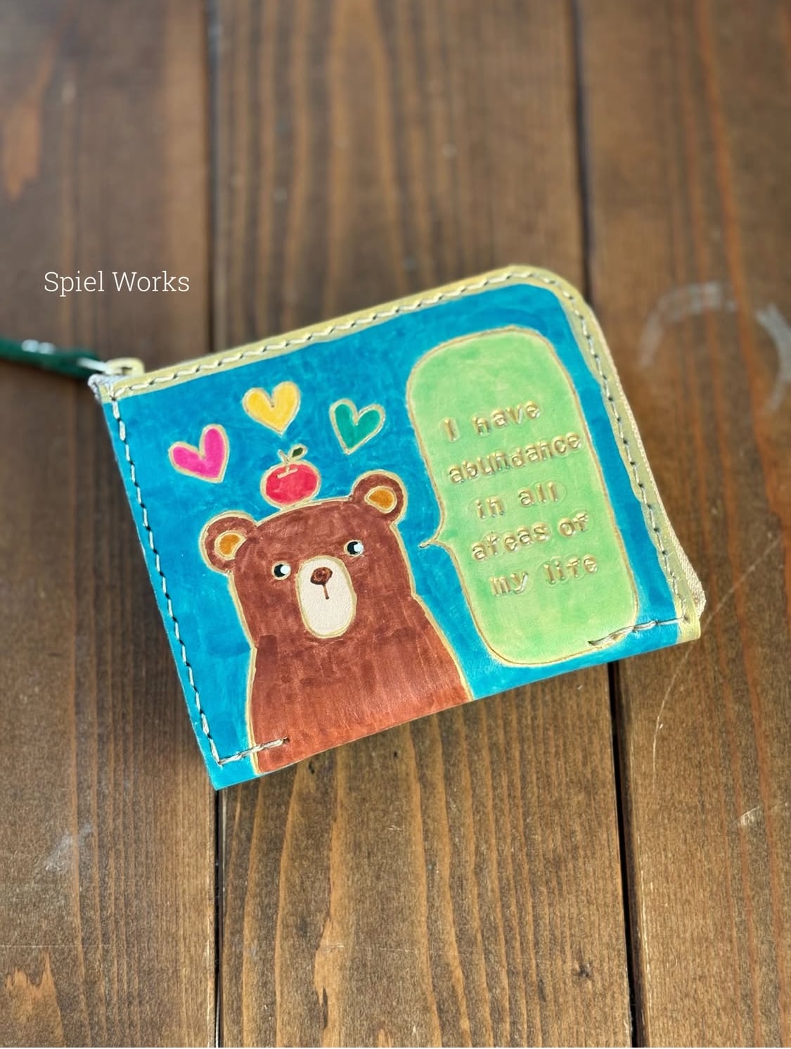 キュートなりんごとクマのペイントが施された、コンパクトな牛革の財布です。